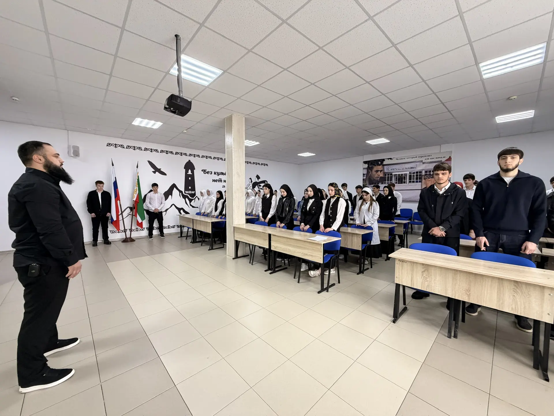 30.03.202630 марта в ГБПОУ «КГК им. Ш. Калиева» состоялась еженедельная патриотическая акция церемониального выноса флагов РФ и ЧР и исполнения гимна РФ и ЧР.На церемонии присутствовали студенты, преподаватели и сотрудники колледжа.Особая честь выноса и установления флагов выпала студентам: Хусиханову Халиду и Бициеву Абдул-Малику.После церемонии студенты отправились на внеурочное занятие "Разговоры о важном". Его темой стал важный для всех возрастов вопрос «Как справляться с волнением?».
